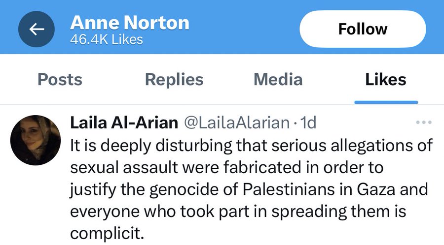 University of Pennsylvania professor, Anne Norton, was caught “liking” a post that claims the horrific rape and violence that took place on October 7, 2023 was fabricated to “justify the genocide of Palestinians in Gaza” and also claims “everyone who took part in spreading them is complicit”.